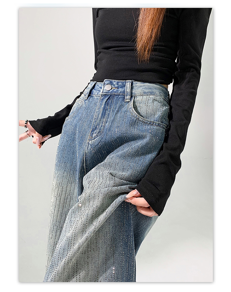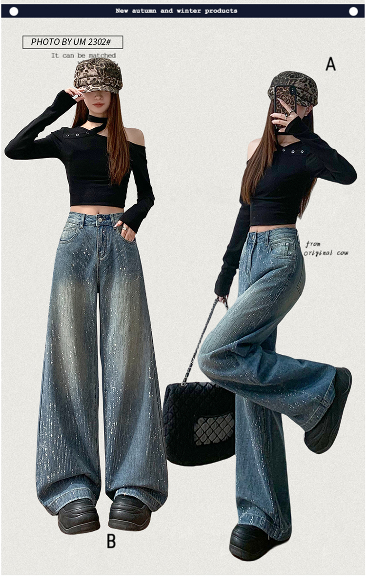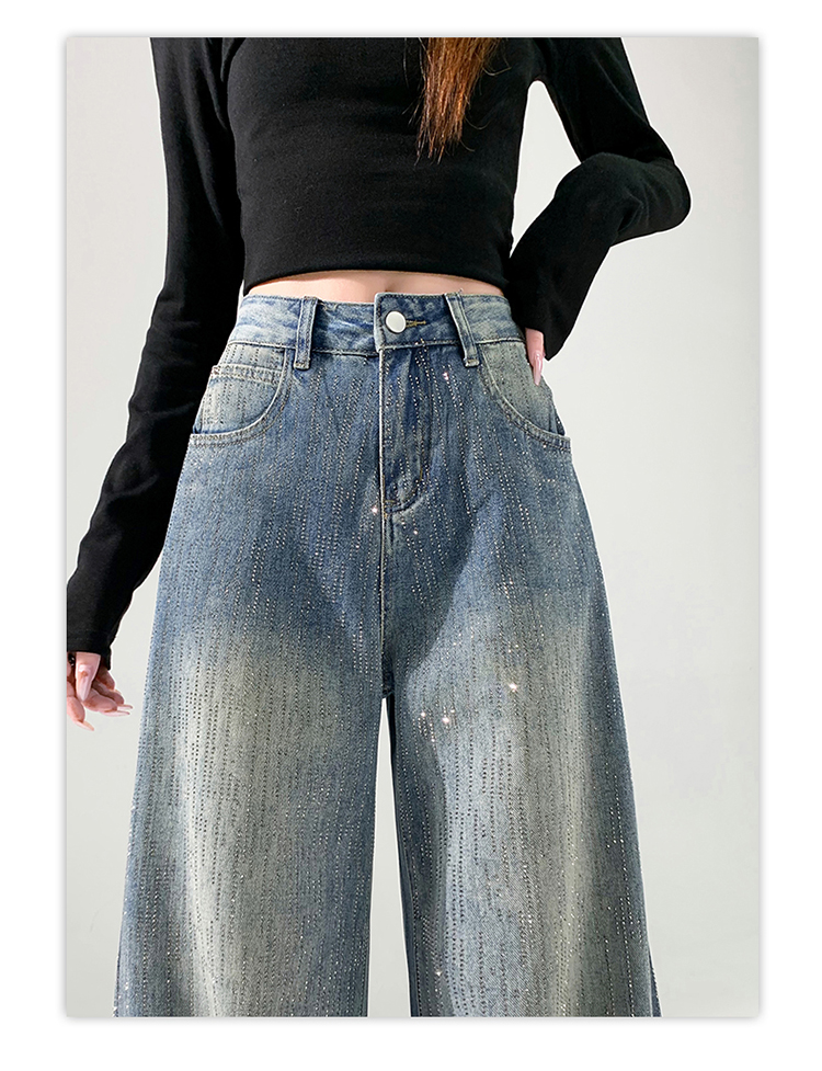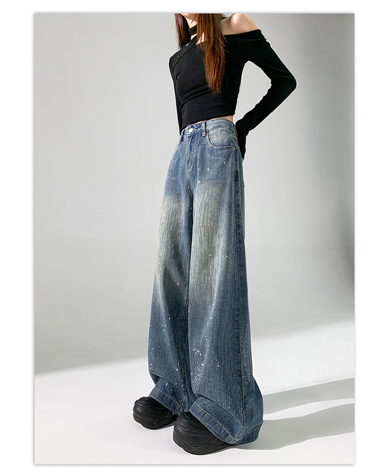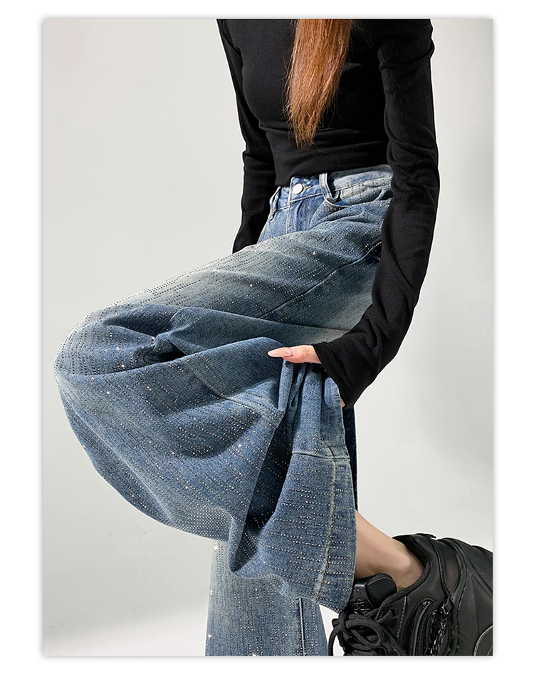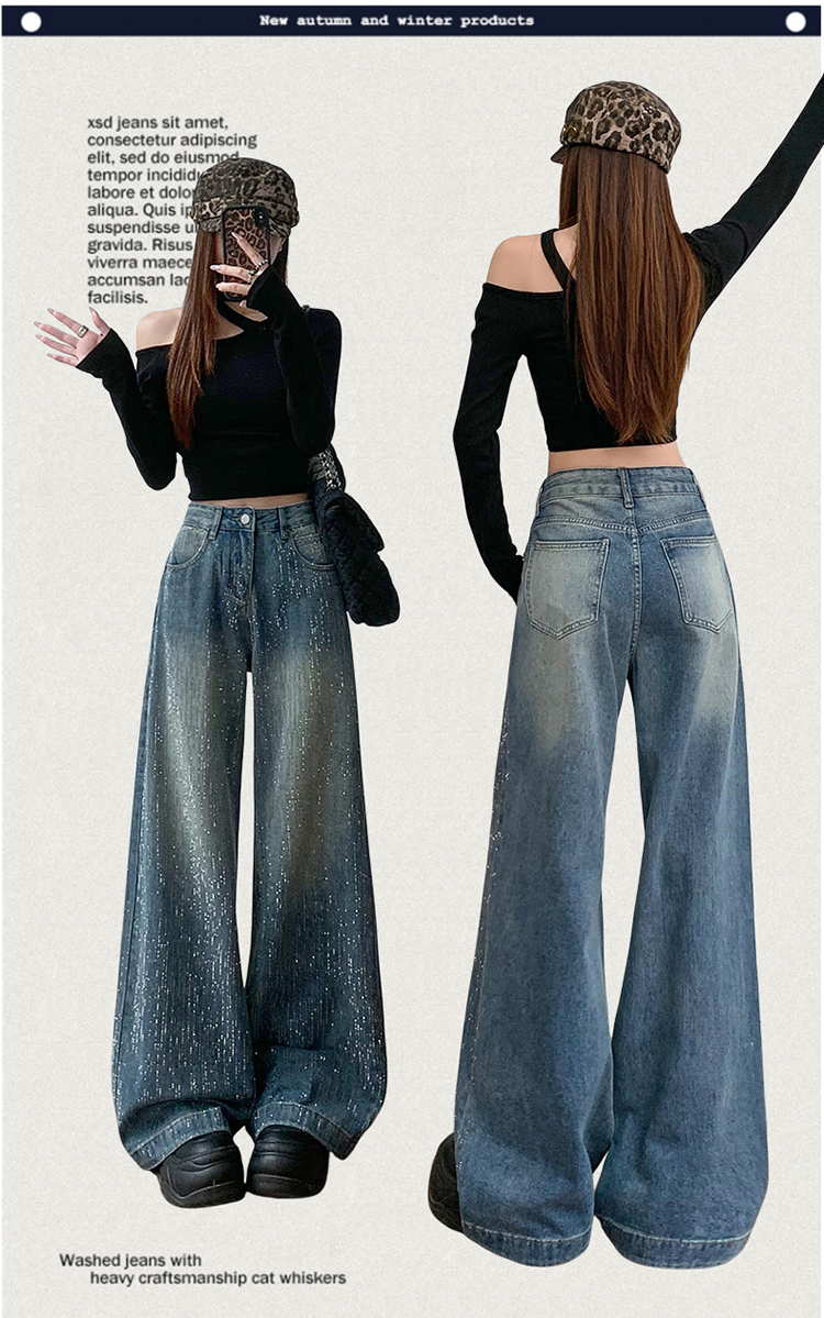 Gypsophila 핫픽스 로우 웨이스트 무거운 작업 청바지 여성 가을 디자인 센스 루즈핏 스트레이트 넓은 다리 밴드 훈련 폭발 플래시 바지