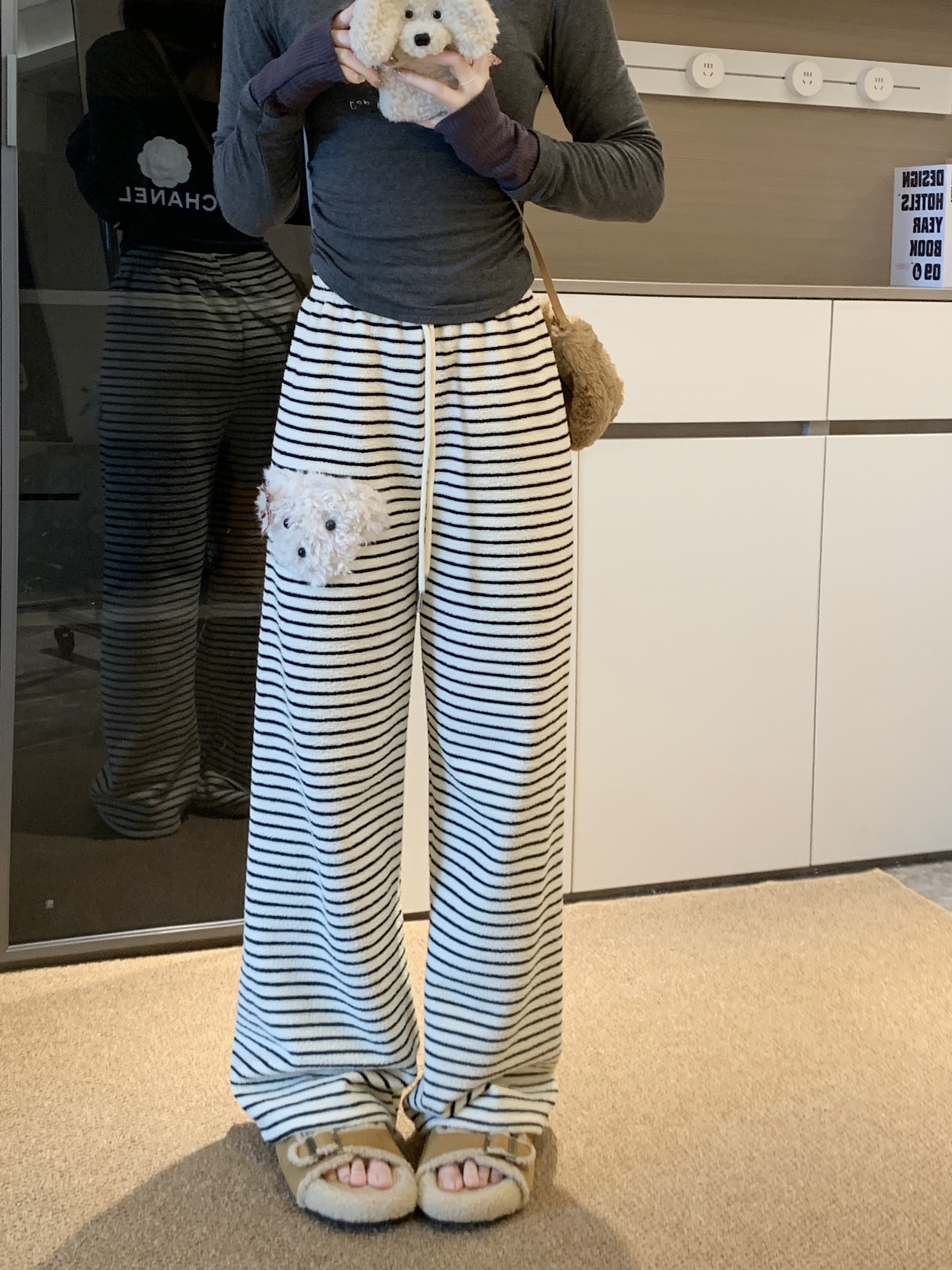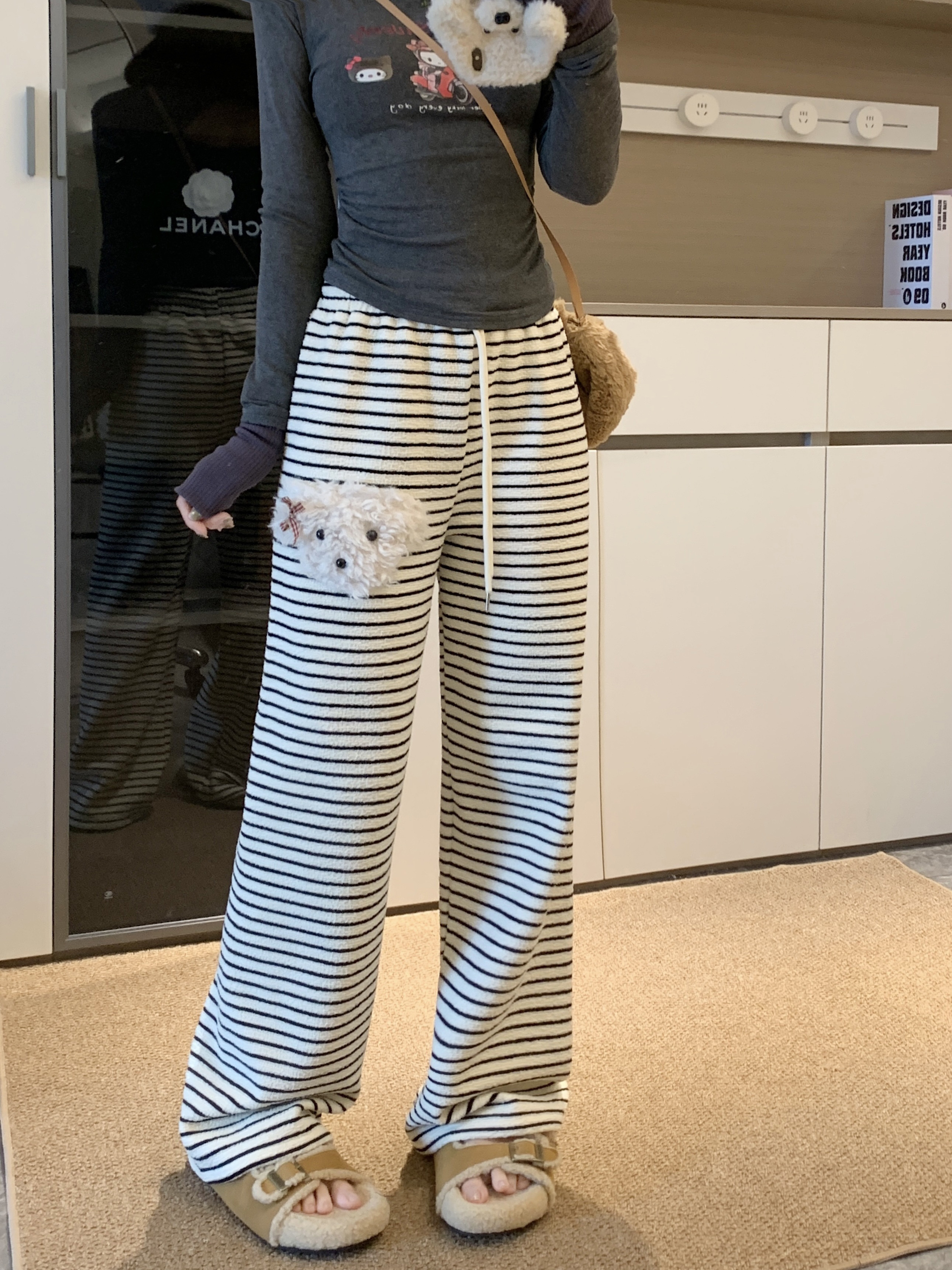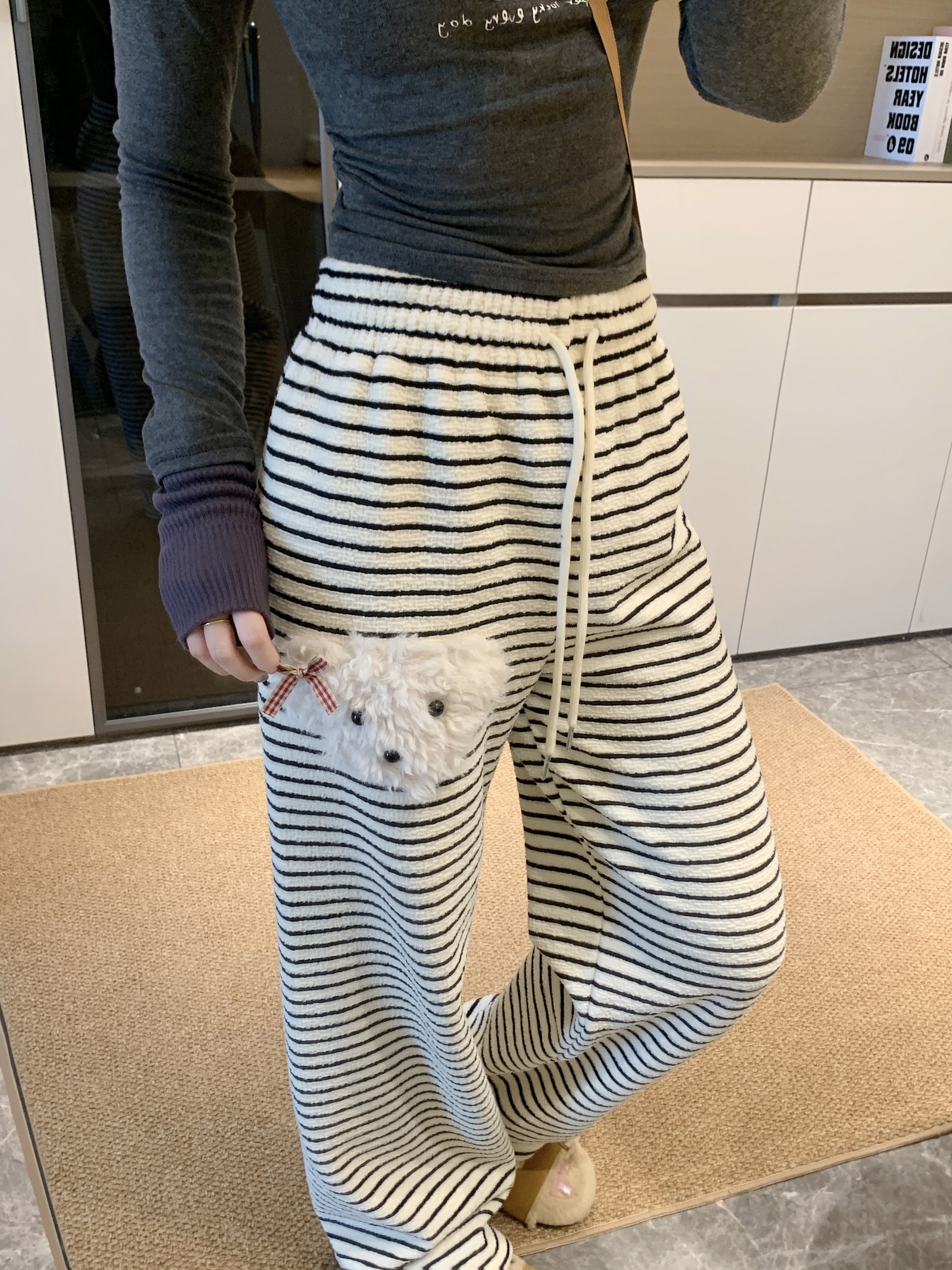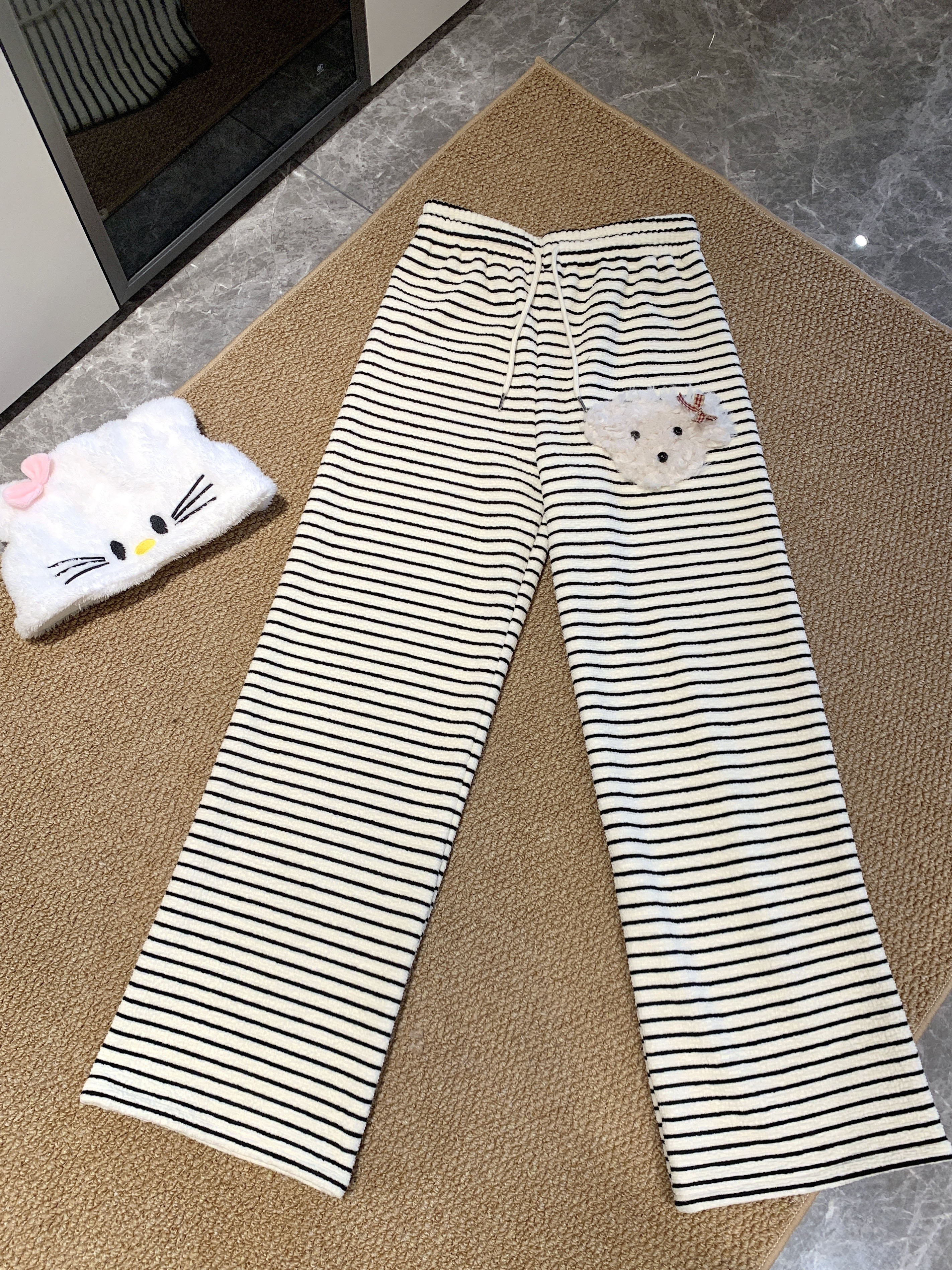 실사 털이 있는 개 스트라이프 바지 아기 플러시 캐주얼 바지 여성 가을 겨울 바지 느긋한 굴곡 바지 스트레이트 팬츠