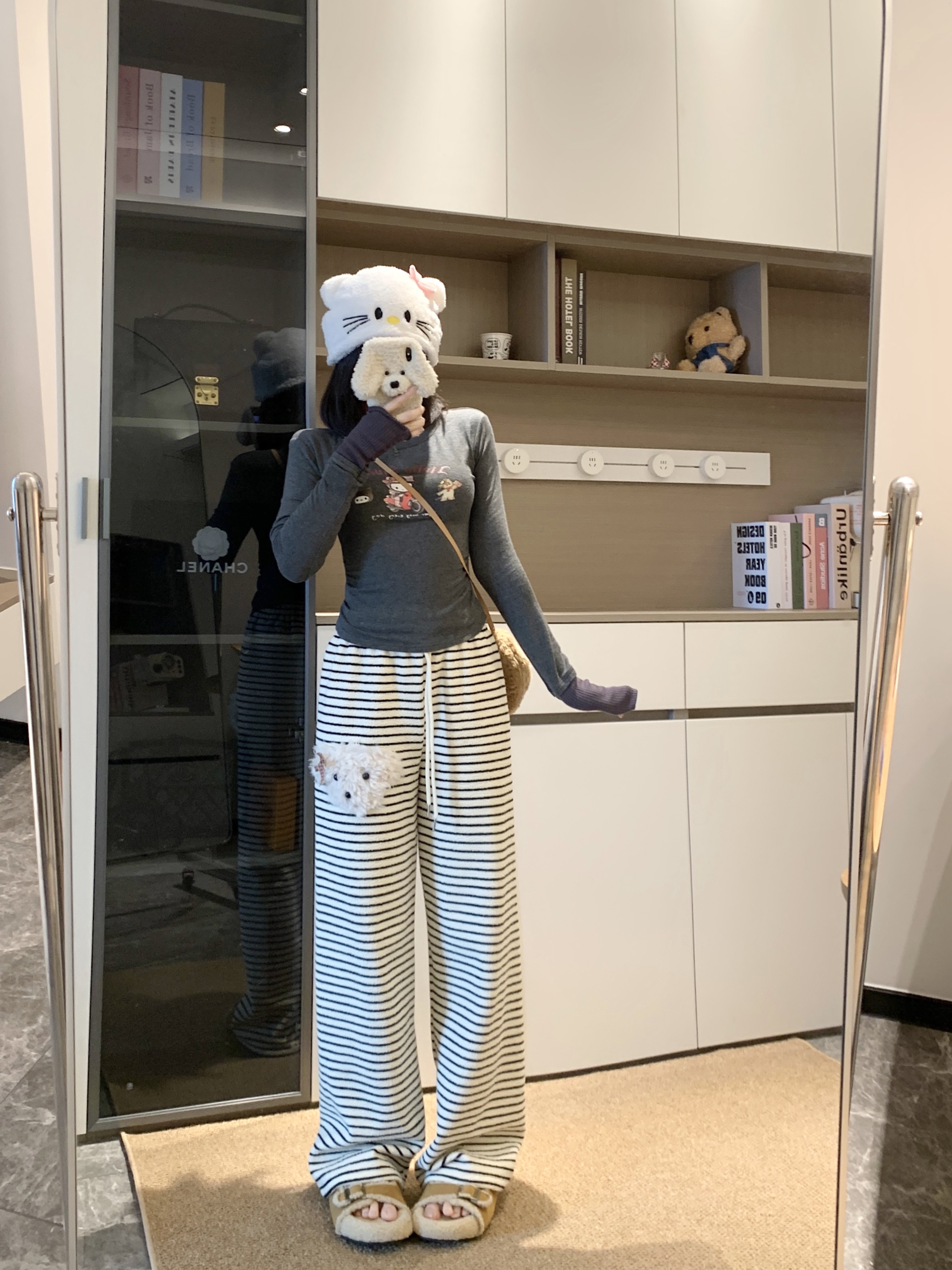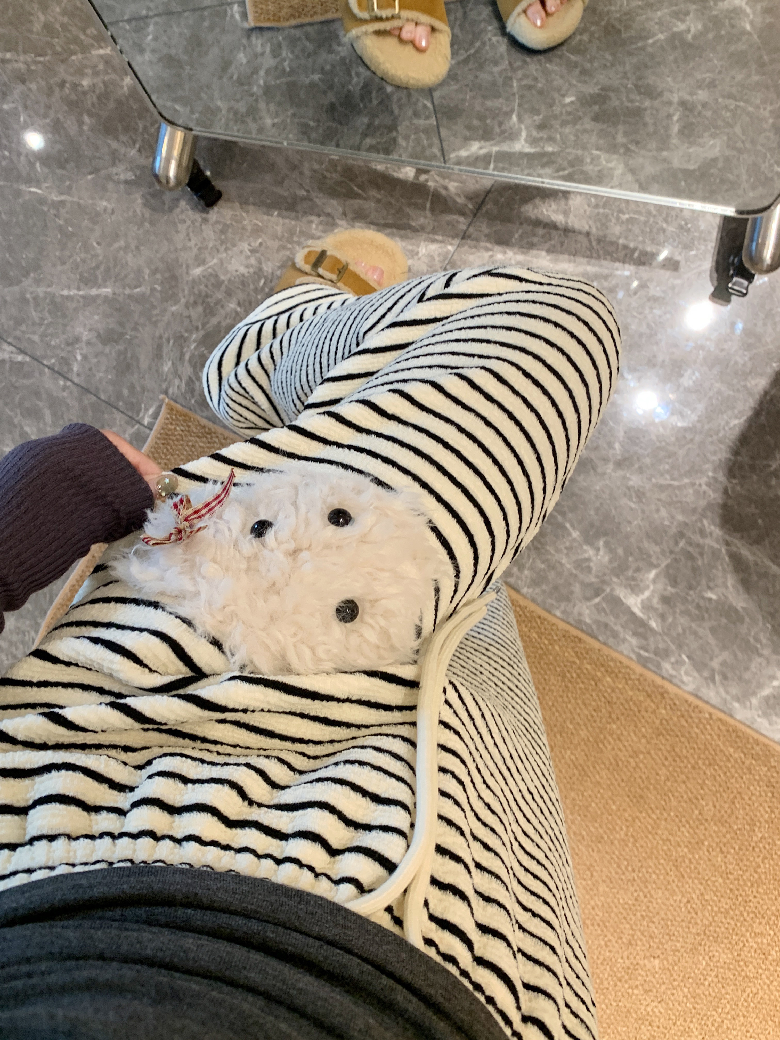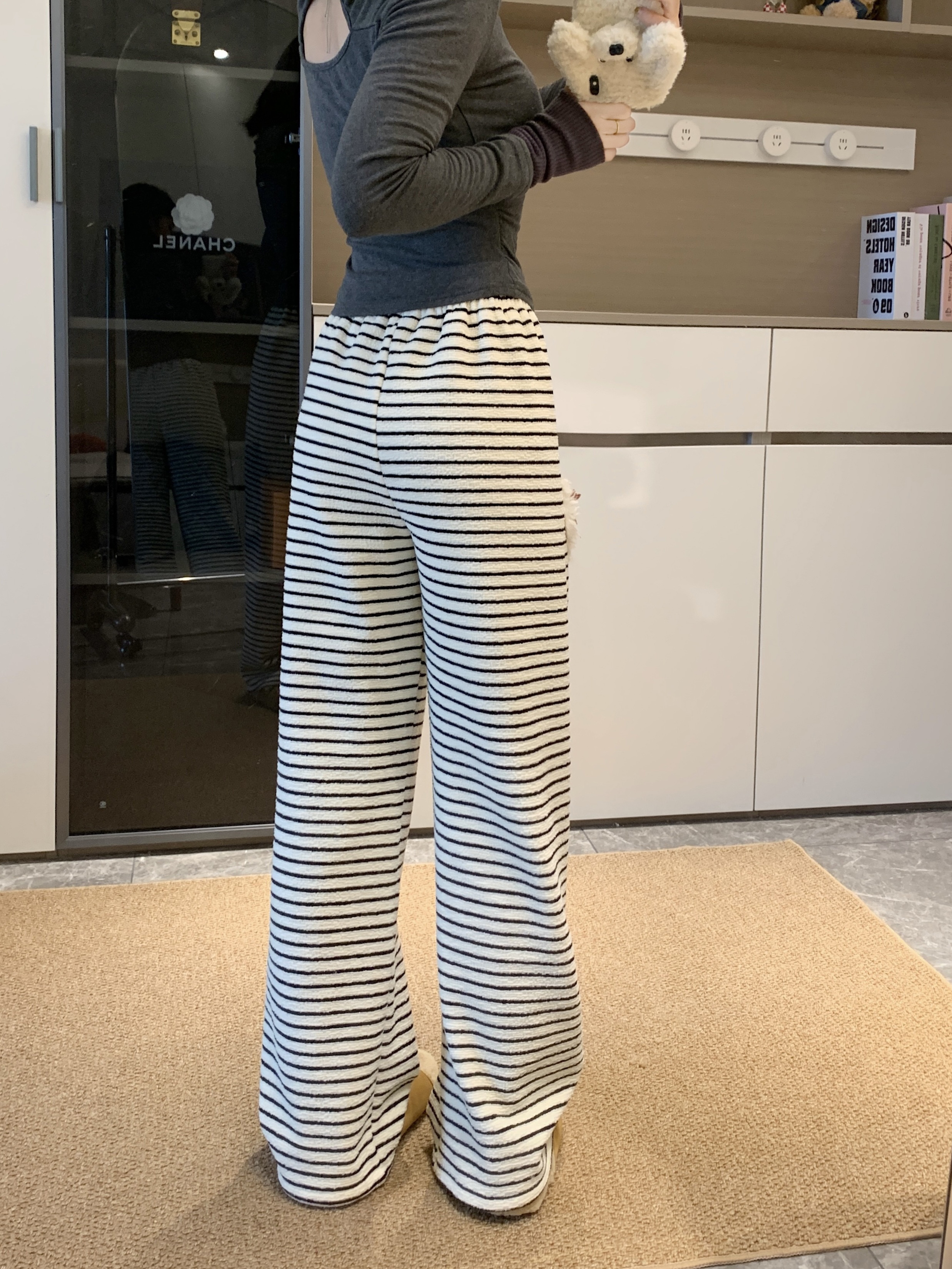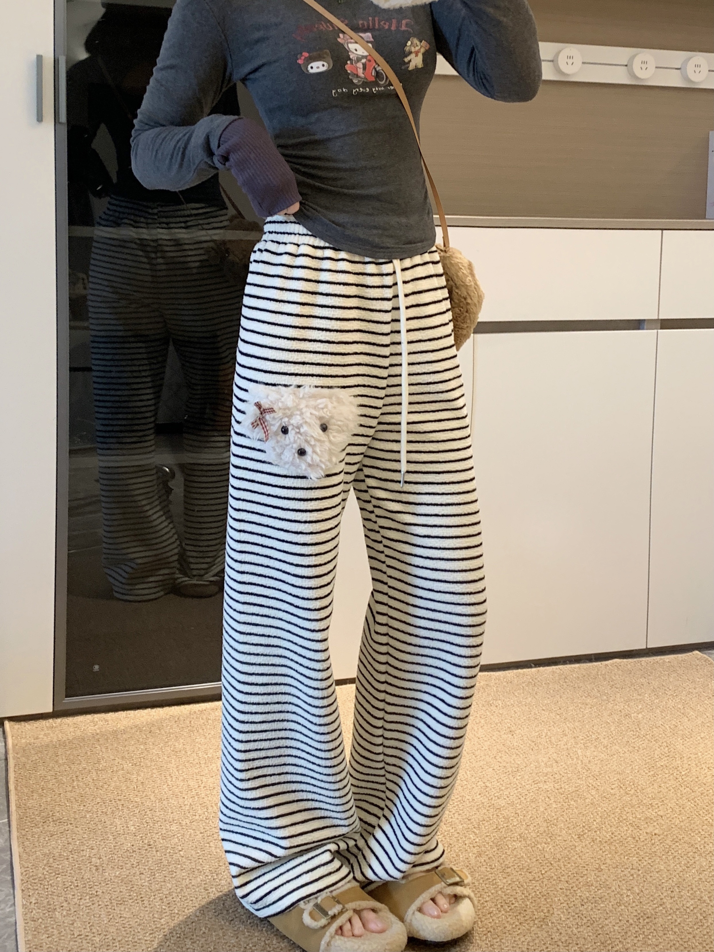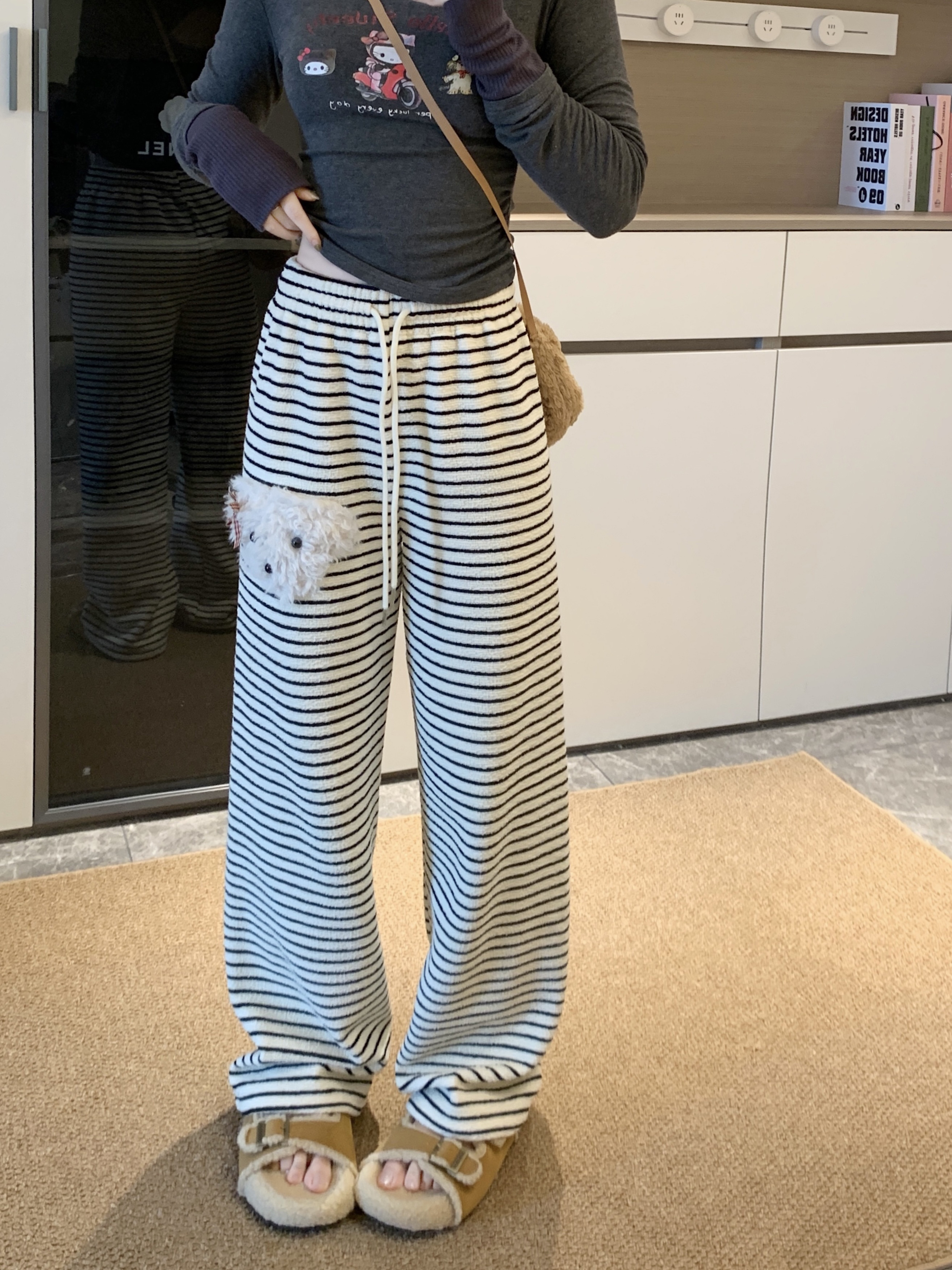 실사 털이 있는 개 스트라이프 바지 아기 플러시 캐주얼 바지 여성 가을 겨울 바지 느긋한 굴곡 바지 스트레이트 팬츠