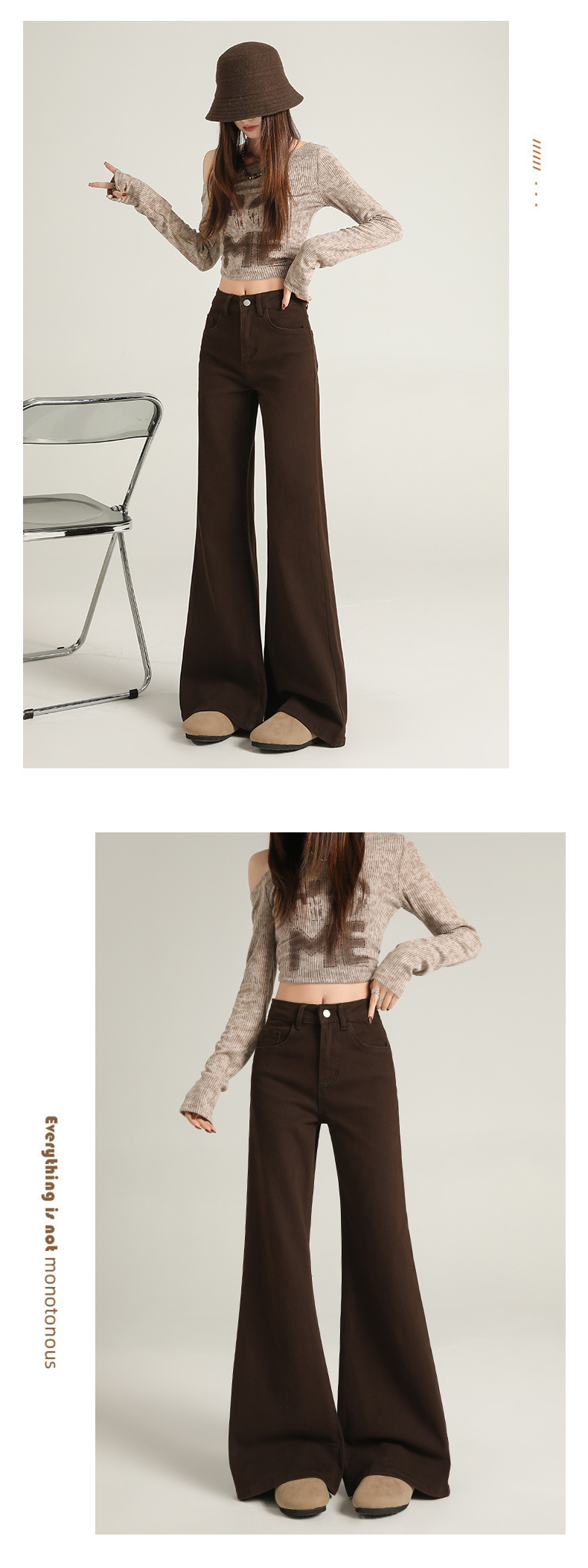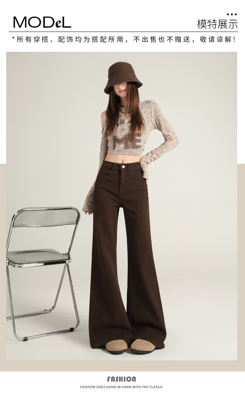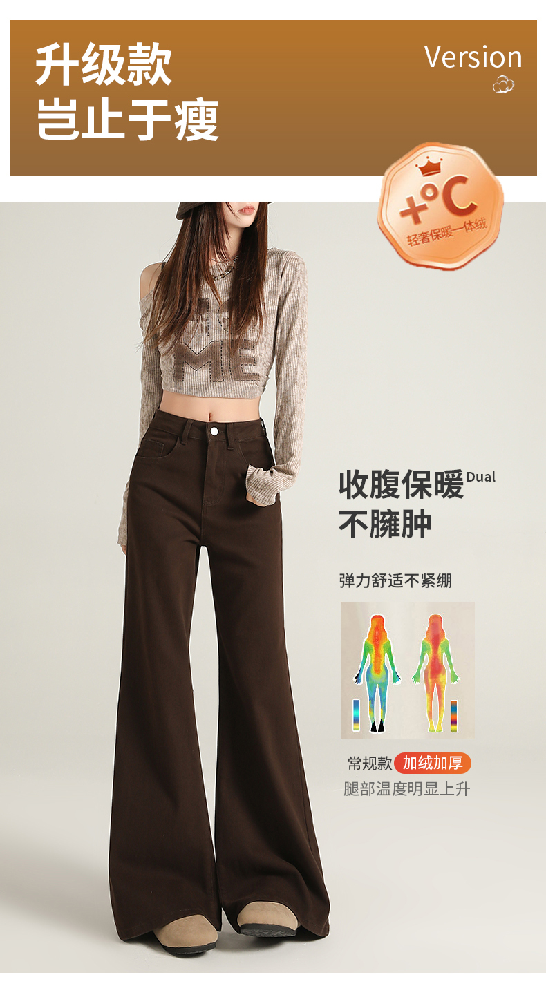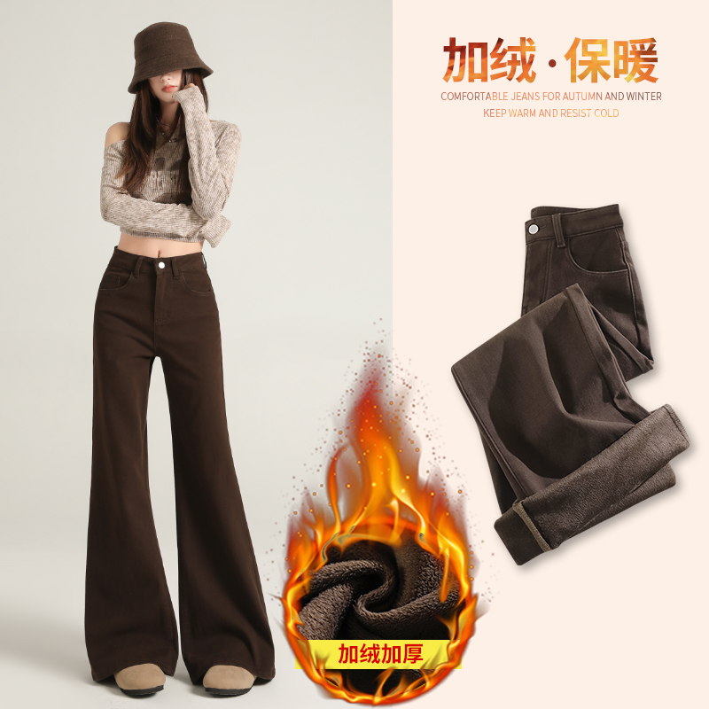 커피 색상 털이 있는 부츠컷 청바지 여성 가을 겨울 새로운 레트로 슬림해 보이는 하이웨이스트 아니요 막대기 다리 루즈핏 나팔 호스 슈 바지