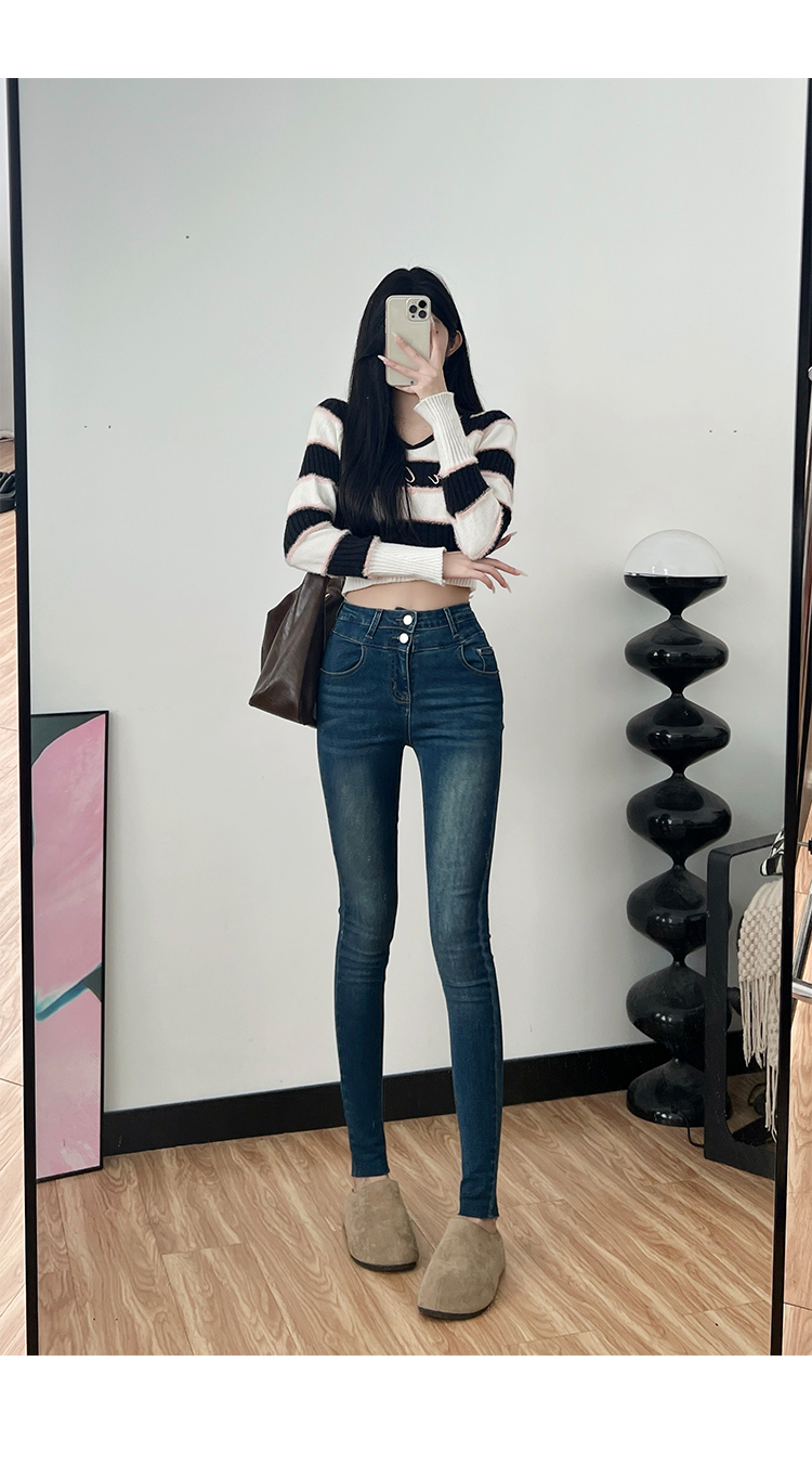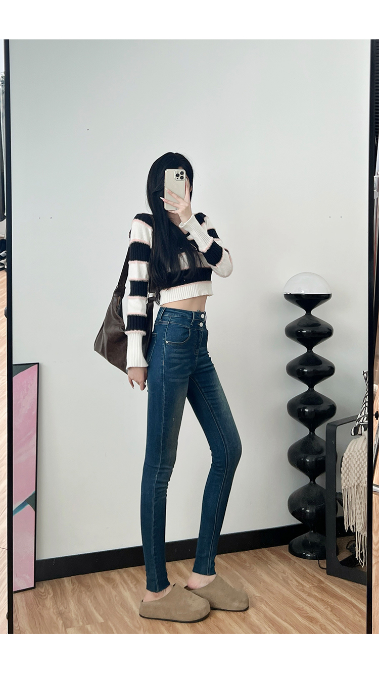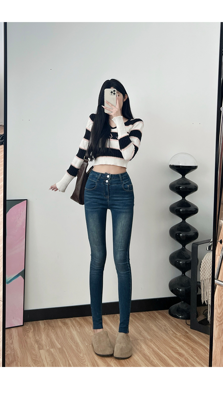 한국 동대문 패션 편안함 신제품 트렌드 여성 의류 펭 넓적 다리 바지 높음 벨트 넓적 다리 패드 명시적 스티치 작은 청바지