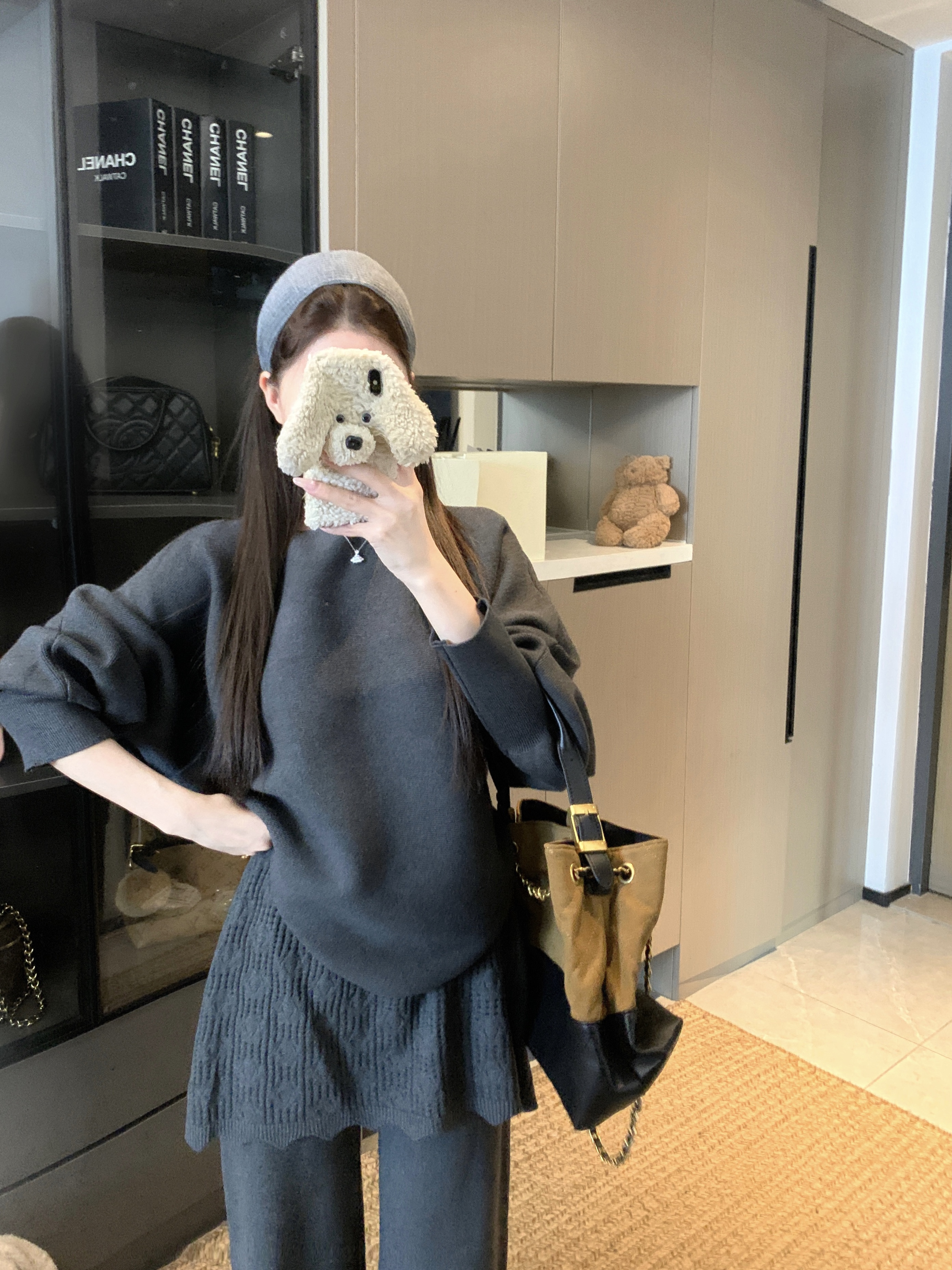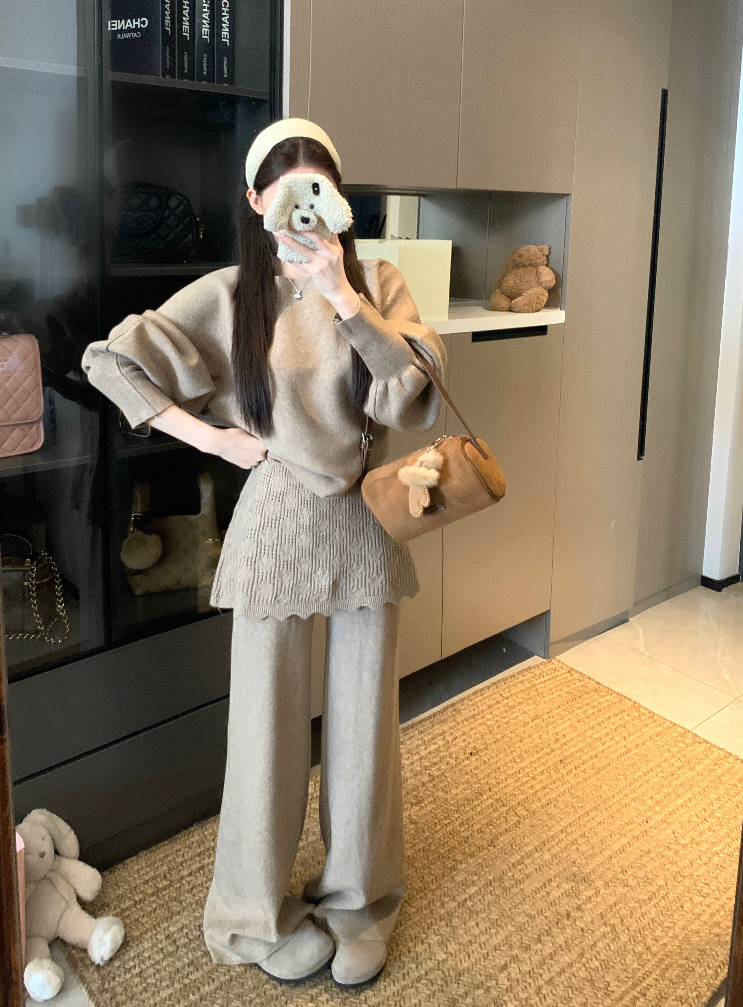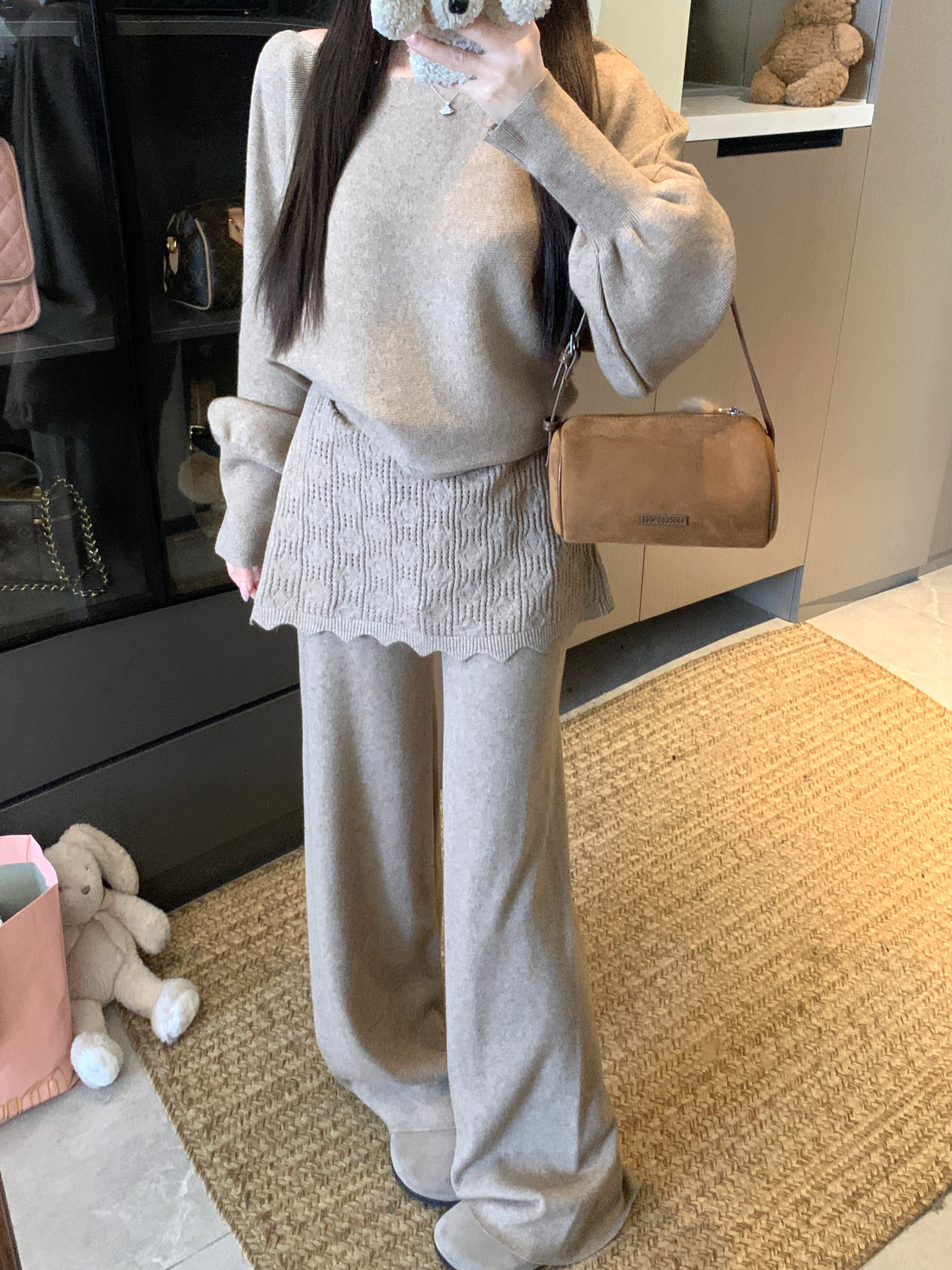 실사 정가 느긋한 바람 배트윙 소매 니트 스웨터 방귀 커튼 바지 두 조각 여성 세트
