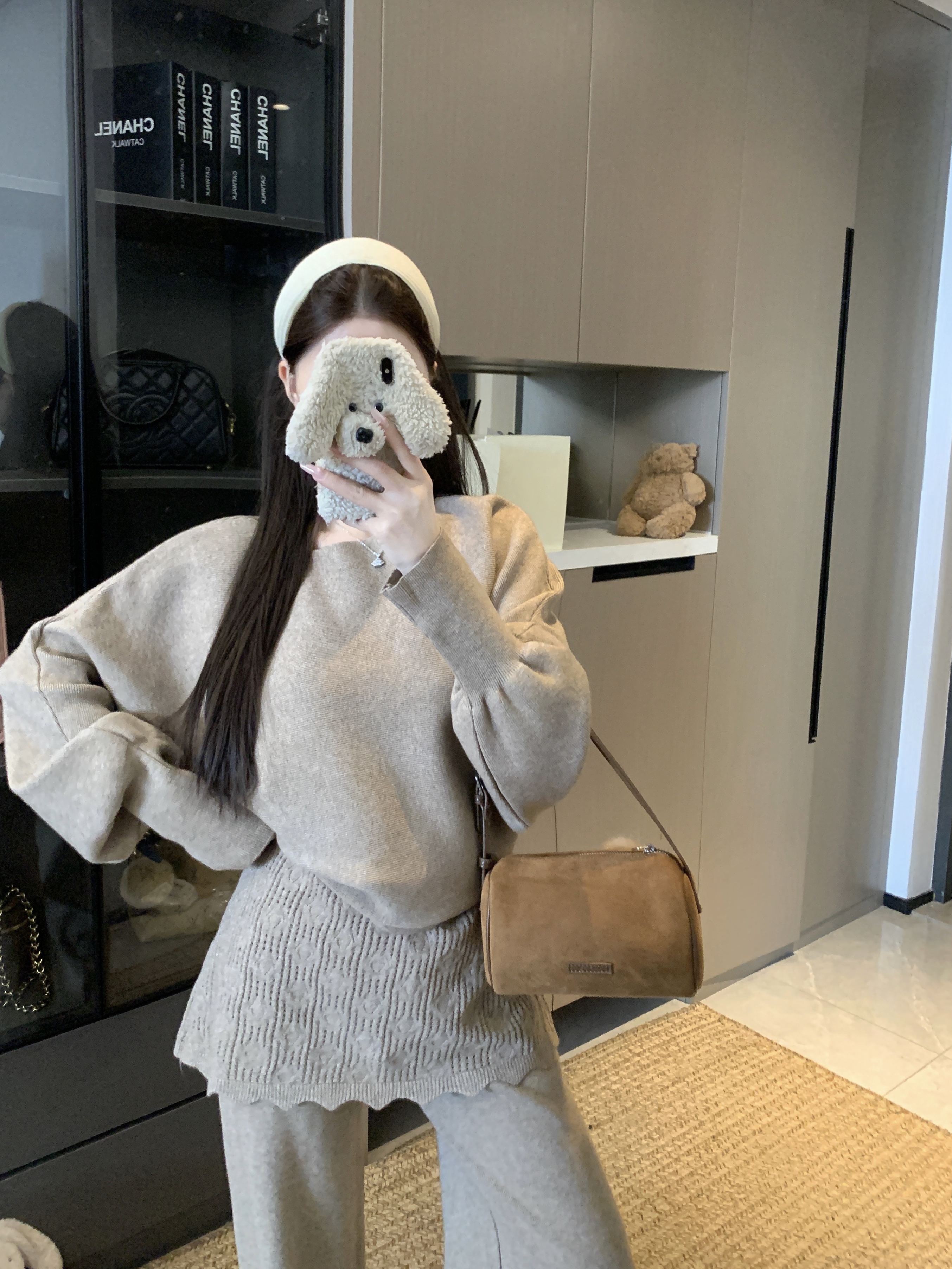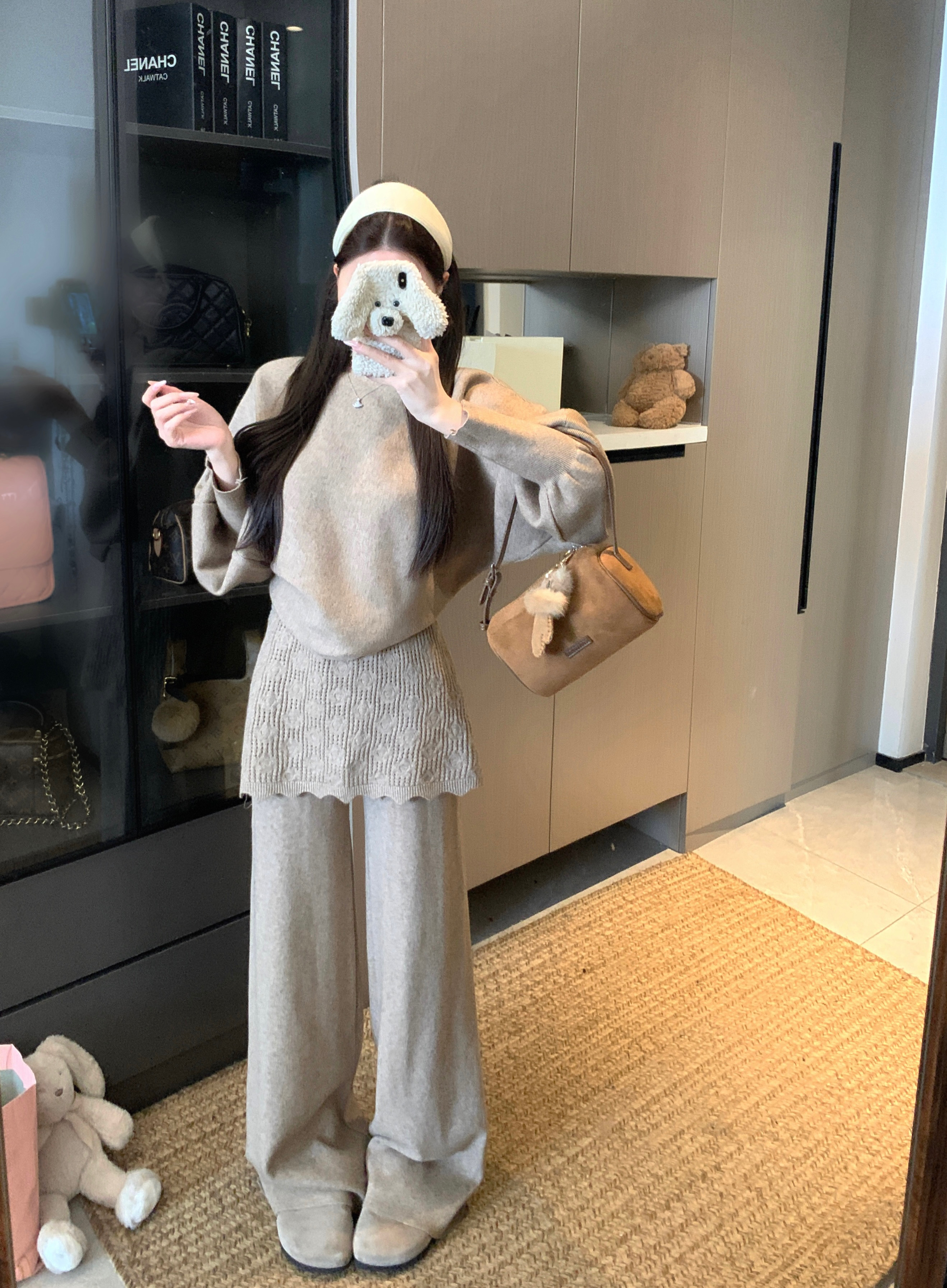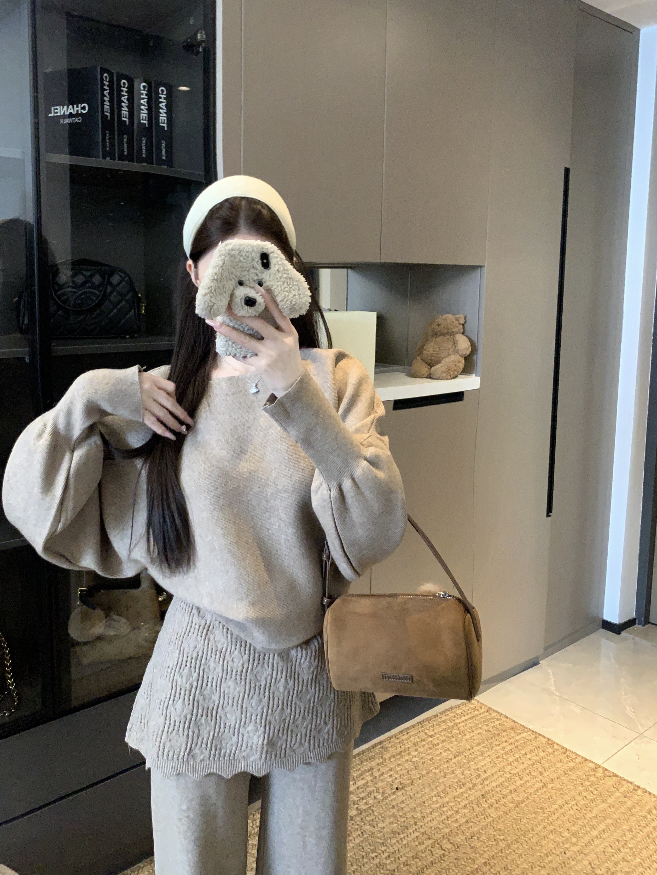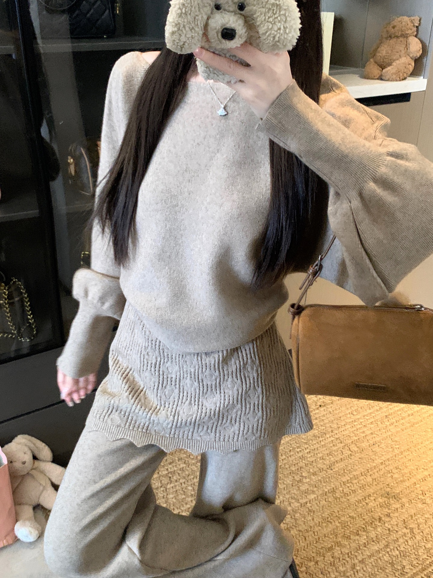 실사 정가 느긋한 바람 배트윙 소매 니트 스웨터 방귀 커튼 바지 두 조각 여성 세트