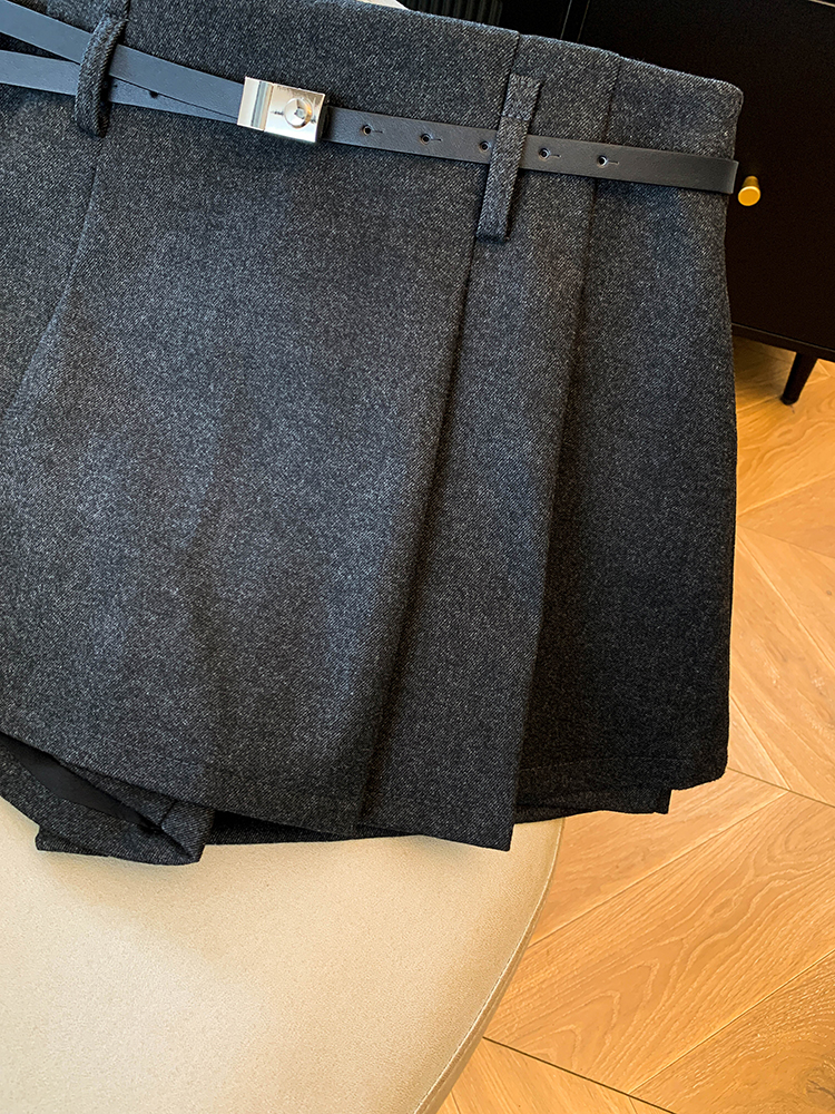 실사 가을 겨울 새로운 벨트 포함 패션 모직 반바지 여성 하이웨이스트 슬림해 보이는 플리츠 스커트 미니 스커트 한 마디 치마바지
