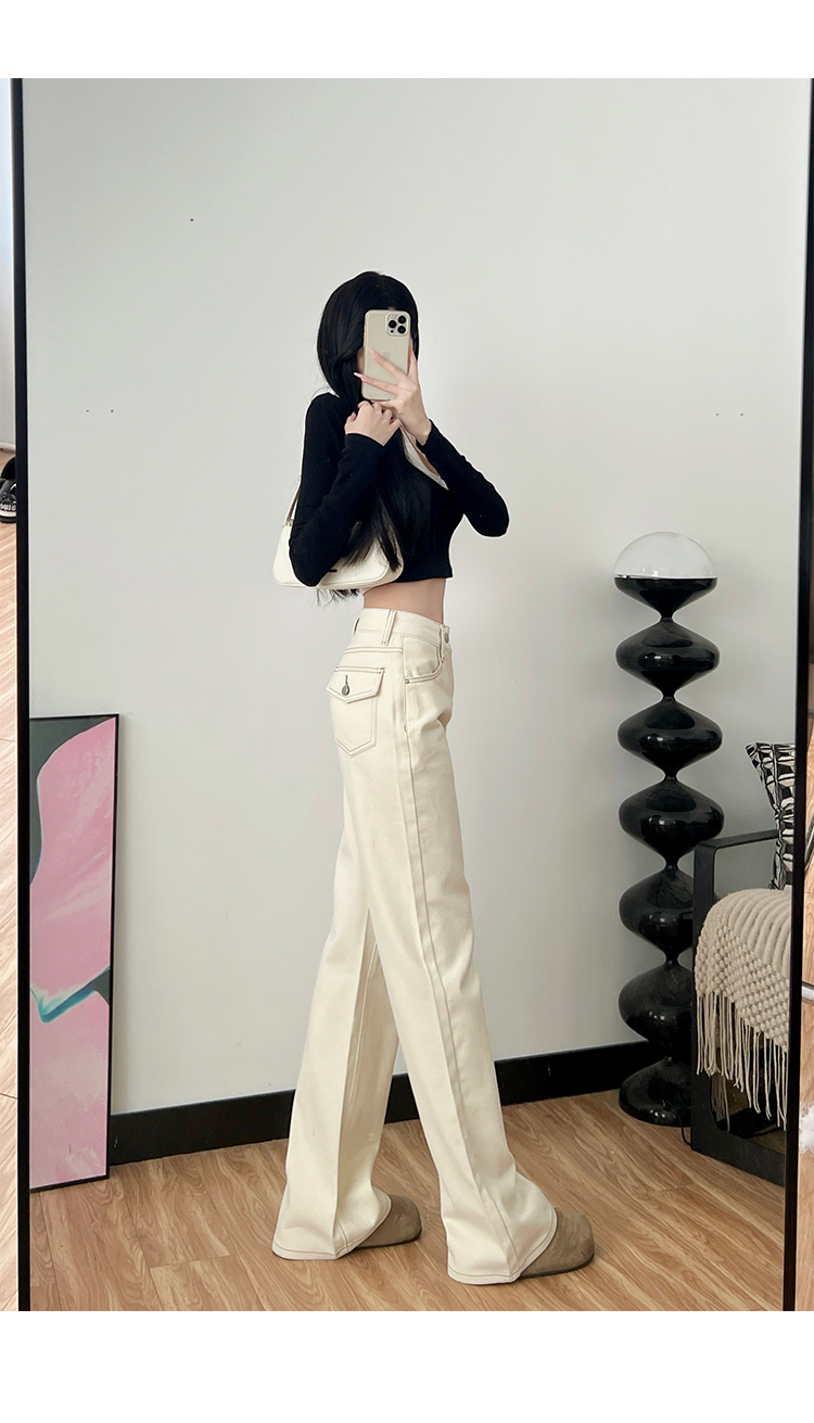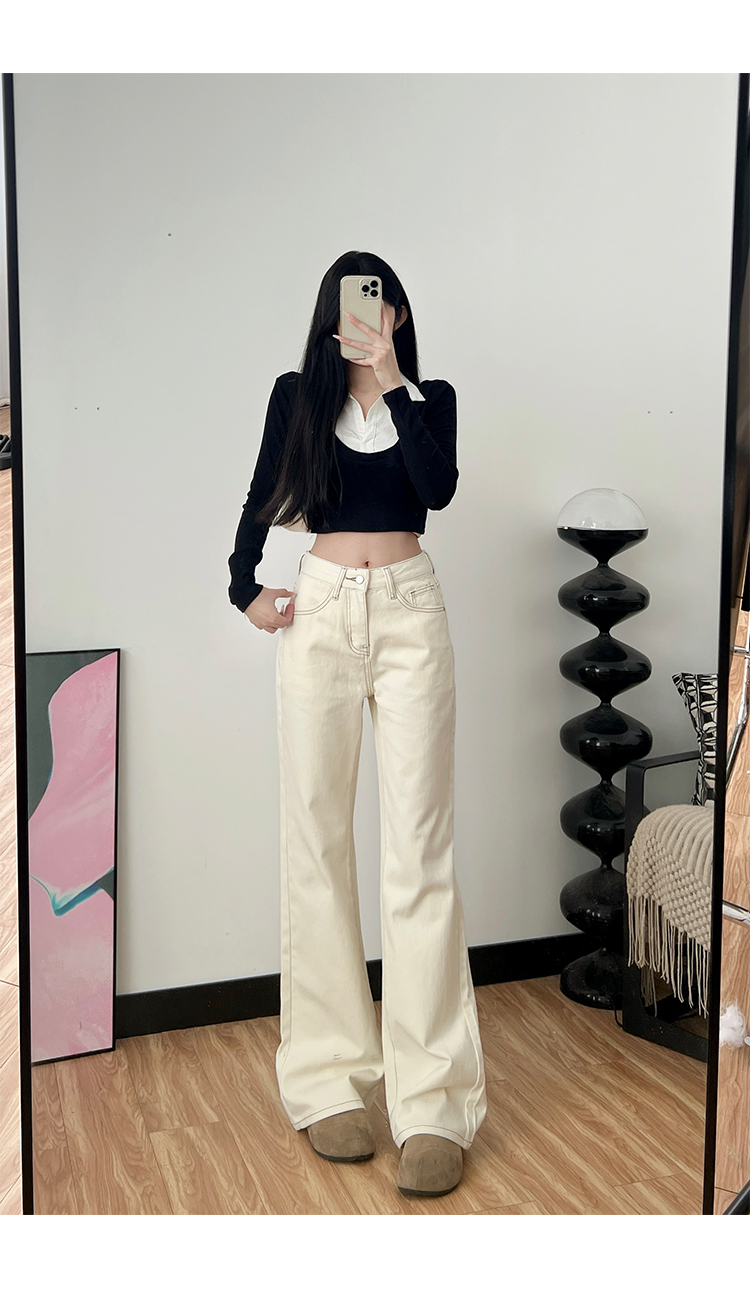 베이지 색 털이 있는 부츠컷 청바지 여성 2025 가을 겨울 새로운 슬림해 보이는 도루 센스 아니요 막대기 다리 스트레이트 나팔 바지