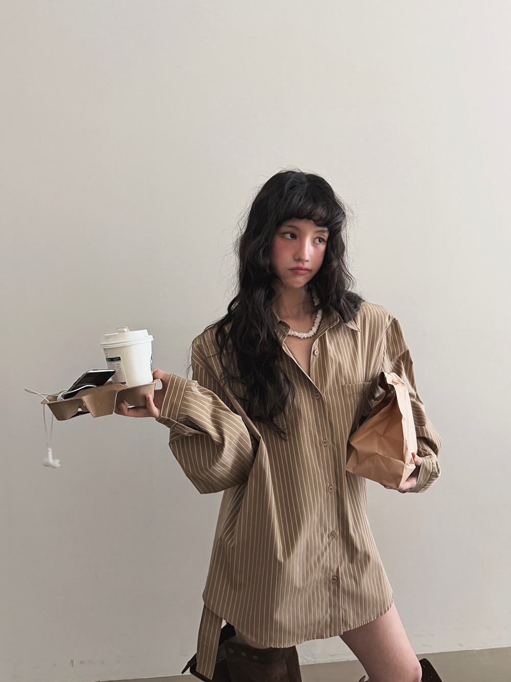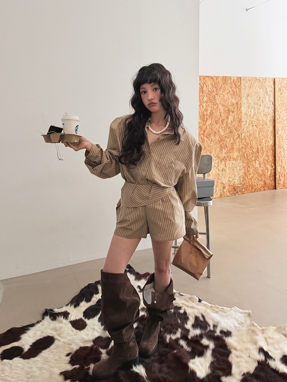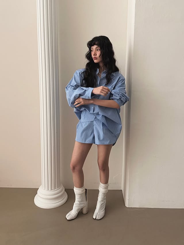 한국 동대문 불규칙 스트라이프 셔츠 하이웨이스트 넓은 다리가 짧다. 바지 투피스 세트