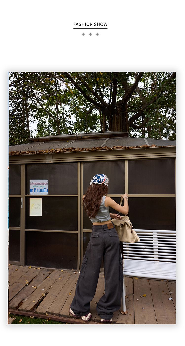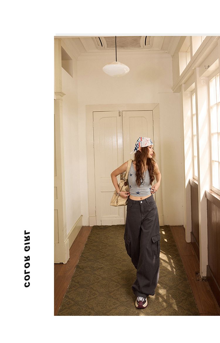 아메리칸 레트로 하이웨이스트 와이드 와이드 레그 팬츠 다용도 도루 센스 봄 여름 모통이 칼 바지 뒤집다 측면 워크웨어 청바지 여성